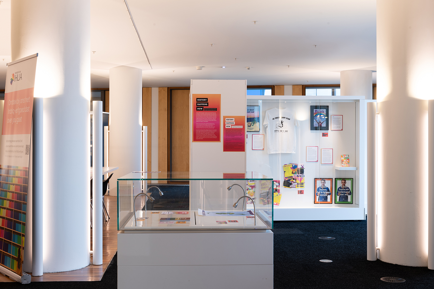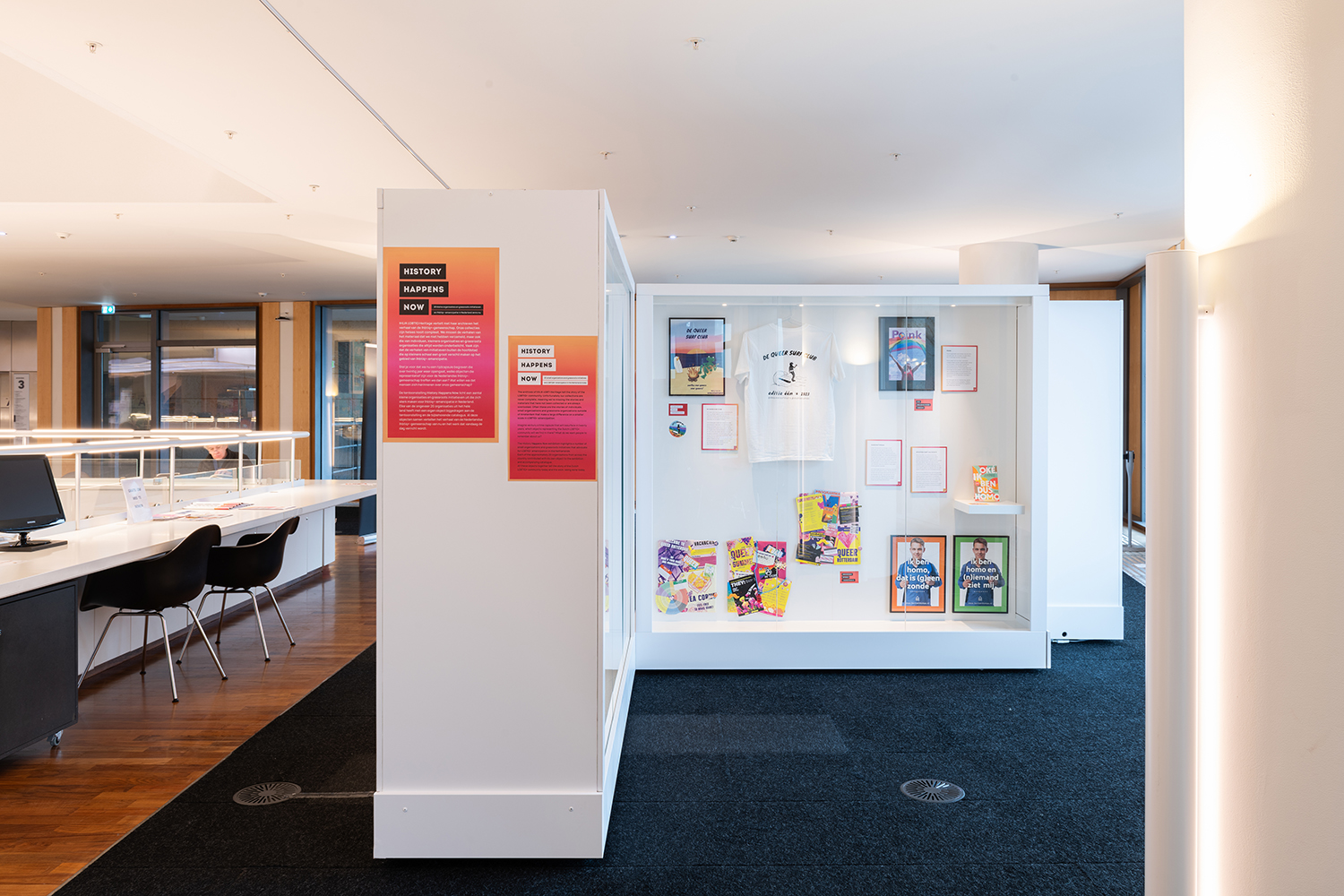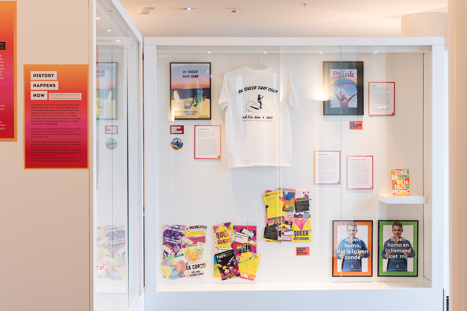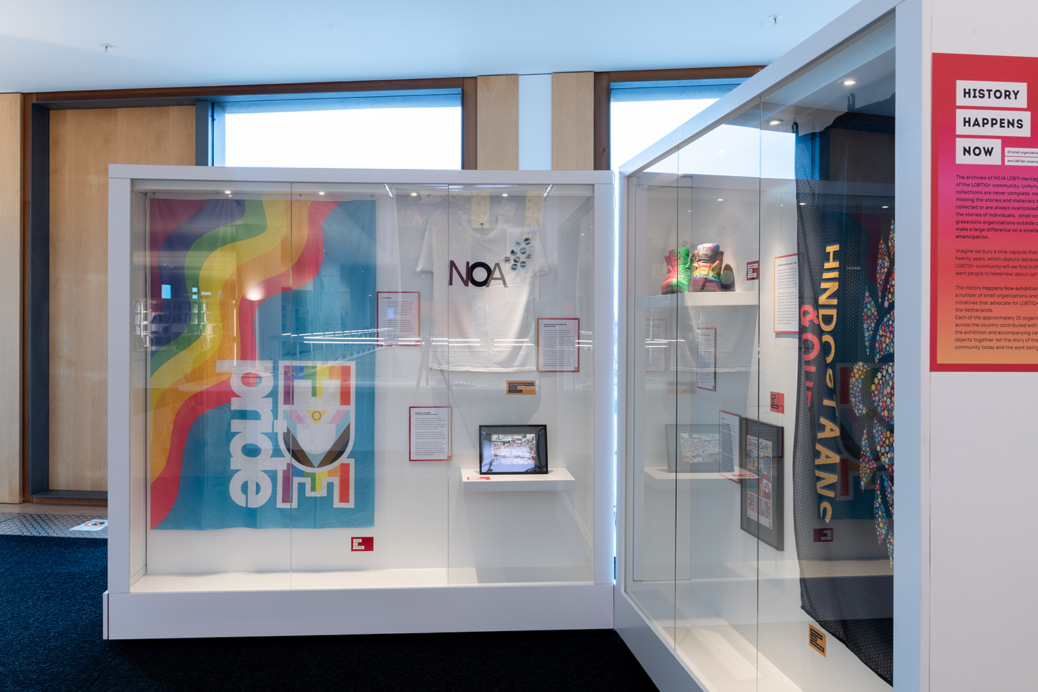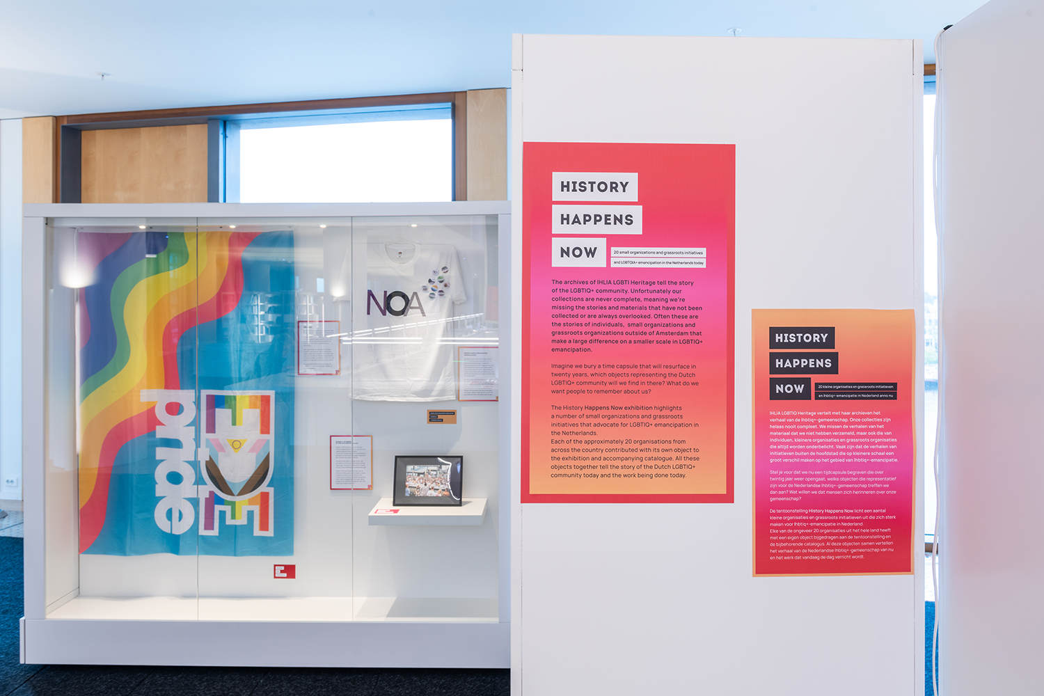 De tentoonstelling History Happens Now  brengt individuen en grassrootsinitiatieven in kaart die vechten voor lhbtiq+-emancipatie in Nederland. Elke van de ongeveer 20 organisaties uit het hele land heeft met een eigen object bijgedragen aan de tentoonstelling en de bijbehorende catalogus. Al deze objecten samen vertellen het verhaal van de Nederlandse lhbtiq+-gemeenschap van nu en het werk dat vandaag de dag verricht wordt. History happens now!Â