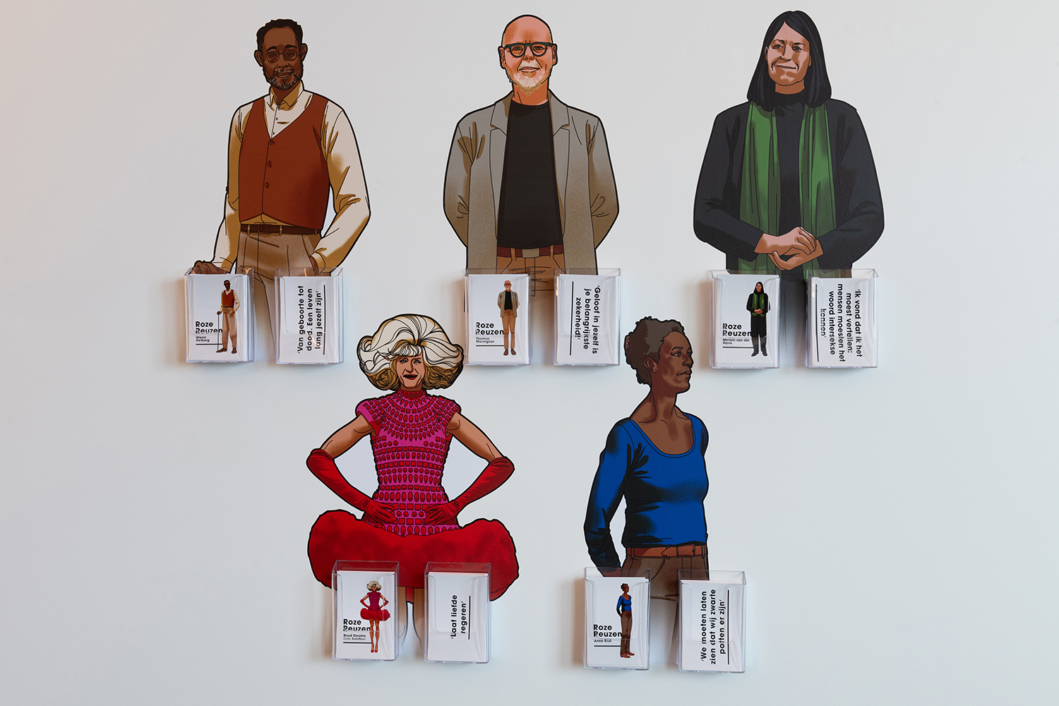 Foto: De vijf Roze Reuzen – v.l.n.r., achterste rij: Glenn Helberg, Thomas Wormgoor en Miriam van der Have – v.l.n.r., voorste rij: Ruud Douma (Dolly Bellefleur) en Anne Krul. Geïllustreerd door Avalon Nuovo